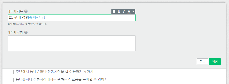 링크에서 확인해보면 동네슈퍼와 전통시장을 구분하지 않고 이용 빈도가 감소한 이유를 묻고 있습니다. 아쉽게도 드롭다운 메뉴 행렬에서 규칙을 적용하는 과정에서 상호모순인 규칙을 적용해야 할 경우가 발생했기 때문에 예시 설문에서 동네 슈퍼와 전통시장을 구분해서 이유를 묻는 방법은 찾지 못했습니다. 현재로서는 서베이몽키에서 복수의 보기 선택에 복수의 로직을 적용하는 방법으로는 해당하는 조건들에 해당하는 페이지를 하나 하나 만들어 대응시키는 것만을 찾은 상황입니다. 서베이몽키가 제공하는 기능의 범위 내에서 다른 방법이 있는지는 여전히 찾고 있는 중입니다.
