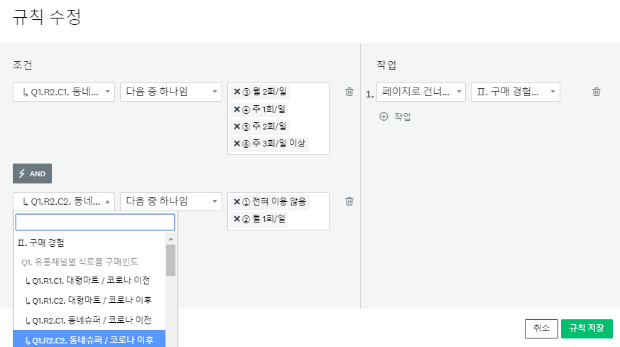드롭다운 메뉴 행렬을 완성한 후에는 해당 페이지 상단의 페이지 로직에서 고급 분기 로직에서 원하는 규칙을 입력합니다. 동네슈퍼에 대해서 코로나 전후로 필요한 조건을 선택하고 조건을 충족할 경우 이동할 페이지도 선택해 줍니다.