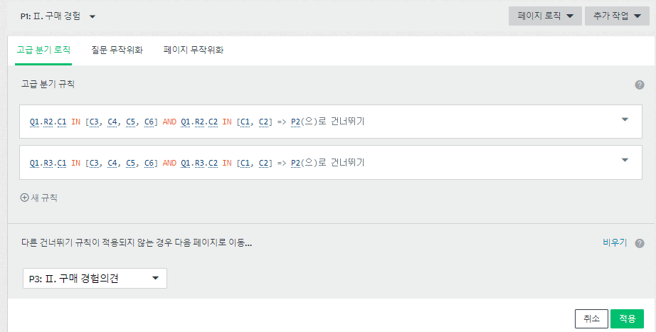서베이몽키 드롭다운 메뉴 행렬에서 구현한 고급 분기 로직은 아래 링크에서 확인해 보시기 바랍니다.